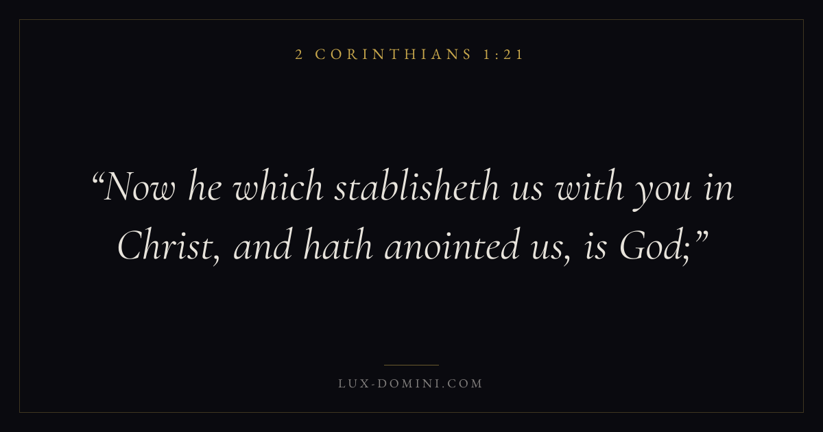 Books / 2 Corinthians / Chapter 1 / Verse 21 ← 2 Corinthians 1:20 2 Corinthians 1:21 2 Corinthians 1:22 → Now he which stablisheth us with you in Christ, and hath anointed us, is God; Download verse card Share on Twitter Share on Facebook Pin it ✦ Key themes Anxiety and fearSuffering and trialsWeaknessMinistry Read with 2 Corinthians 1:172 Corinthians 1:18Philippians 4:6Isaiah 41:10 Related topics Bible verses about anxiety and fearBible verses about suffering and trialsBible verses about strength ✦ 2 Corinthians Chapter 1 verses V. 1 V. 2 V. 3 V. 4 V. 5 V. 6 V. 7 V. 8 V. 9 V. 10 V. 11 V. 12 V. 13 V. 14 V. 15 V. 16 V. 17 V. 18 V. 19 V. 20 V. 21 V. 22 V. 23 V. 24