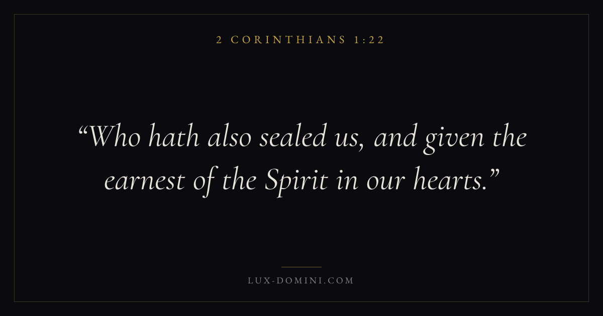 Books / 2 Corinthians / Chapter 1 / Verse 22 ← 2 Corinthians 1:21 2 Corinthians 1:22 2 Corinthians 1:23 → Who hath also sealed us, and given the earnest of the Spirit in our hearts. Download verse card Share on Twitter Share on Facebook Pin it ✦ Key themes Anxiety and fearSuffering and trialsWeaknessMinistry Read with 2 Corinthians 1:232 Corinthians 1:24Philippians 4:6Isaiah 41:10 Related topics Bible verses about anxiety and fearBible verses about suffering and trialsBible verses about strength ✦ 2 Corinthians Chapter 1 verses V. 1 V. 2 V. 3 V. 4 V. 5 V. 6 V. 7 V. 8 V. 9 V. 10 V. 11 V. 12 V. 13 V. 14 V. 15 V. 16 V. 17 V. 18 V. 19 V. 20 V. 21 V. 22 V. 23 V. 24