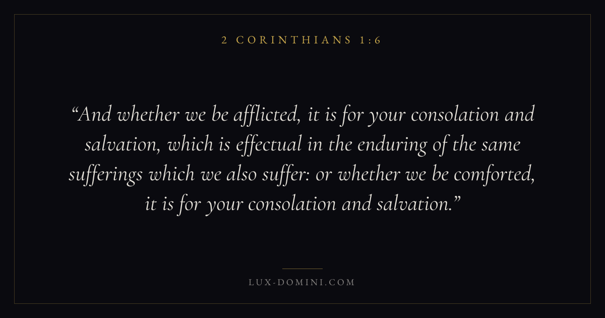 And whether we be afflicted, it is for your consolation and salvation, which is effectual in the enduring of the same sufferings which we also suffer: or whether we be comforted, it is for your consolation and salvation.