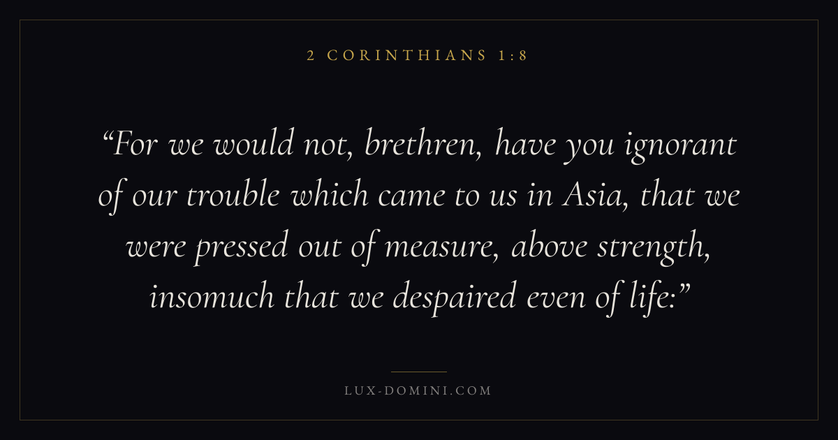 For we would not, brethren, have you ignorant of our trouble which came to us in Asia, that we were pressed out of measure, above strength, insomuch that we despaired even of life: