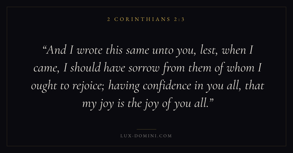 And I wrote this same unto you, lest, when I came, I should have sorrow from them of whom I ought to rejoice; having confidence in you all, that my joy is the joy of you all.