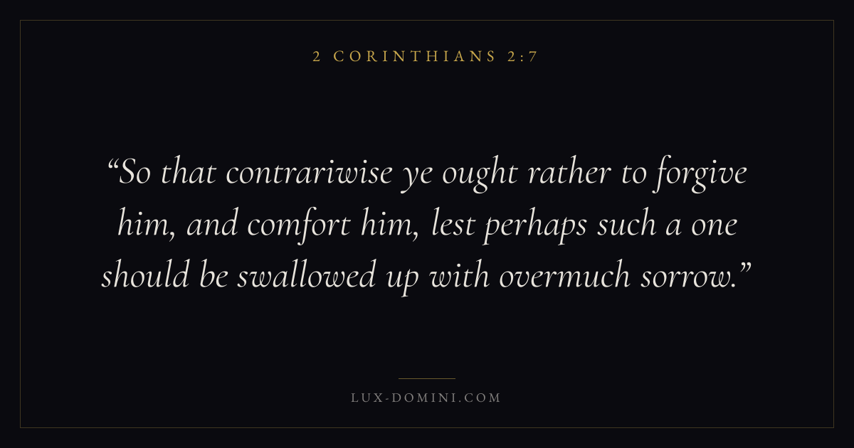 So that contrariwise ye ought rather to forgive him, and comfort him, lest perhaps such a one should be swallowed up with overmuch sorrow.