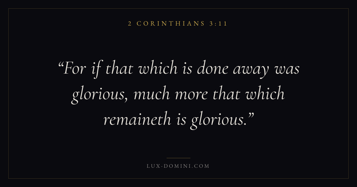 Books / 2 Corinthians / Chapter 3 / Verse 11 ← 2 Corinthians 3:10 2 Corinthians 3:11 2 Corinthians 3:12 → For if that which is done away was glorious, much more that which remaineth is glorious. Download verse card Share on Twitter Share on Facebook Pin it ✦ Key themes Suffering and trialsHumilityWeaknessMinistry Read with 2 Corinthians 3:92 Corinthians 3:10Romans 8:182 Corinthians 4:17 Related topics Bible verses about suffering and trialsBible verses about humilityBible verses about strength ✦ 2 Corinthians Chapter 3 verses V. 1 V. 2 V. 3 V. 4 V. 5 V. 6 V. 7 V. 8 V. 9 V. 10 V. 11 V. 12 V. 13 V. 14 V. 15 V. 16 V. 17 V. 18