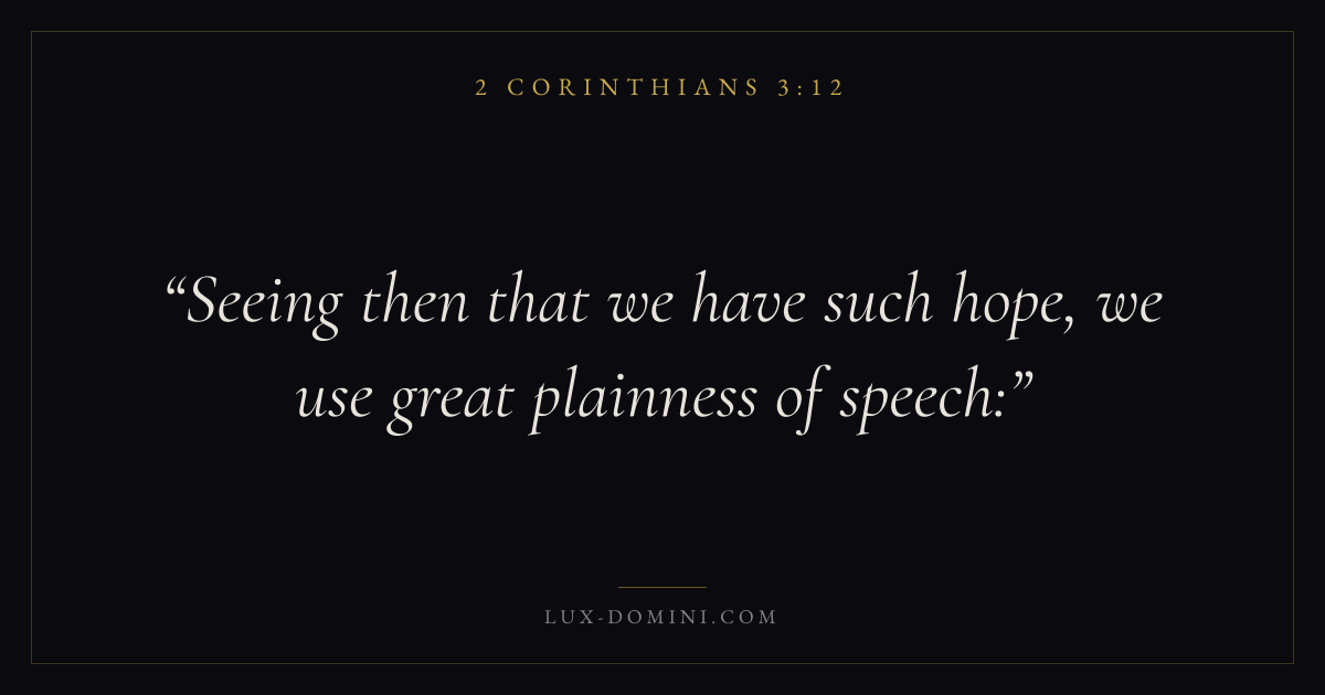 Books / 2 Corinthians / Chapter 3 / Verse 12 ← 2 Corinthians 3:11 2 Corinthians 3:12 2 Corinthians 3:13 → Seeing then that we have such hope, we use great plainness of speech: Download verse card Share on Twitter Share on Facebook Pin it ✦ Key themes HopeSuffering and trialsWeaknessMinistry Read with 2 Corinthians 3:132 Corinthians 3:14Romans 8:24Revelation 21:4 Related topics Bible verses about hopeBible verses about suffering and trialsBible verses about strength ✦ 2 Corinthians Chapter 3 verses V. 1 V. 2 V. 3 V. 4 V. 5 V. 6 V. 7 V. 8 V. 9 V. 10 V. 11 V. 12 V. 13 V. 14 V. 15 V. 16 V. 17 V. 18
