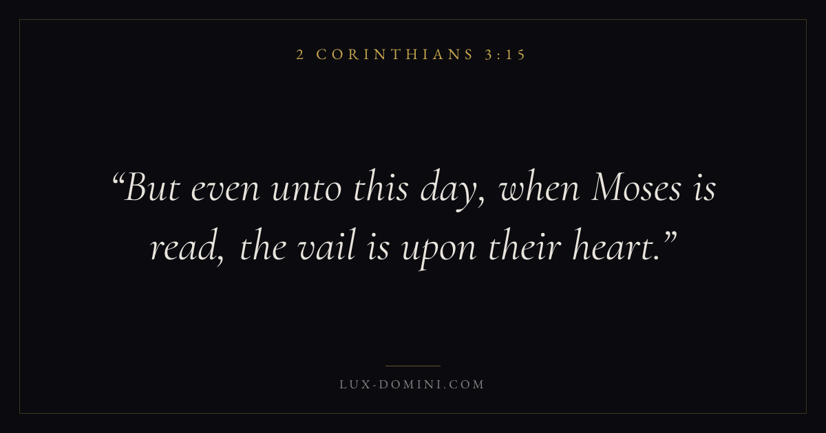 Books / 2 Corinthians / Chapter 3 / Verse 15 ← 2 Corinthians 3:14 2 Corinthians 3:15 2 Corinthians 3:16 → But even unto this day, when Moses is read, the vail is upon their heart. Download verse card Share on Twitter Share on Facebook Pin it ✦ Key themes Suffering and trialsWeaknessMinistryReconciliation Read with 2 Corinthians 3:122 Corinthians 3:13Romans 8:182 Corinthians 4:17 Related topics Bible verses about suffering and trialsBible verses about strength ✦ 2 Corinthians Chapter 3 verses V. 1 V. 2 V. 3 V. 4 V. 5 V. 6 V. 7 V. 8 V. 9 V. 10 V. 11 V. 12 V. 13 V. 14 V. 15 V. 16 V. 17 V. 18