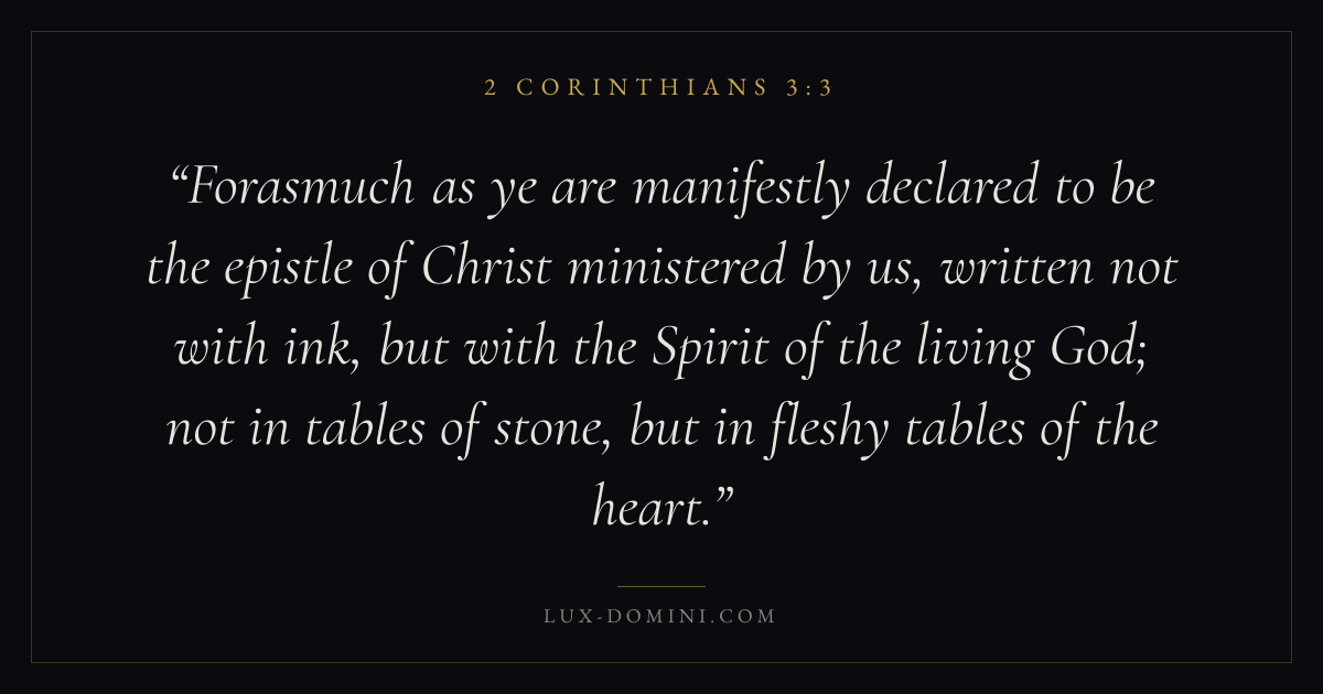 Forasmuch as ye are manifestly declared to be the epistle of Christ ministered by us, written not with ink, but with the Spirit of the living God; not in tables of stone, but in fleshy tables of the heart.