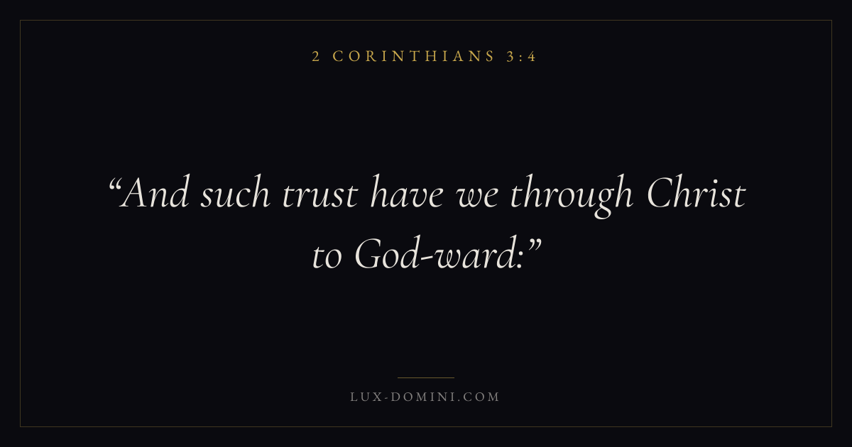 Books / 2 Corinthians / Chapter 3 / Verse 4 ← 2 Corinthians 3:3 2 Corinthians 3:4 2 Corinthians 3:5 → And such trust have we through Christ to God-ward: Download verse card Share on Twitter Share on Facebook Pin it ✦ Key themes FaithSuffering and trialsHumilityWeakness Read with 2 Corinthians 3:52 Corinthians 3:6Hebrews 11:1Romans 10:17 Related topics Bible verses about faithBible verses about suffering and trialsBible verses about humilityBible verses about strength ✦ 2 Corinthians Chapter 3 verses V. 1 V. 2 V. 3 V. 4 V. 5 V. 6 V. 7 V. 8 V. 9 V. 10 V. 11 V. 12 V. 13 V. 14 V. 15 V. 16 V. 17 V. 18