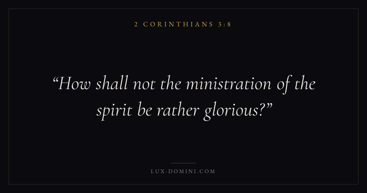 Books / 2 Corinthians / Chapter 3 / Verse 8 ← 2 Corinthians 3:7 2 Corinthians 3:8 2 Corinthians 3:9 → How shall not the ministration of the spirit be rather glorious? Download verse card Share on Twitter Share on Facebook Pin it ✦ Key themes Suffering and trialsHumilityWeaknessMinistry Read with 2 Corinthians 3:42 Corinthians 3:5Romans 8:182 Corinthians 4:17 Related topics Bible verses about suffering and trialsBible verses about humilityBible verses about strength ✦ 2 Corinthians Chapter 3 verses V. 1 V. 2 V. 3 V. 4 V. 5 V. 6 V. 7 V. 8 V. 9 V. 10 V. 11 V. 12 V. 13 V. 14 V. 15 V. 16 V. 17 V. 18