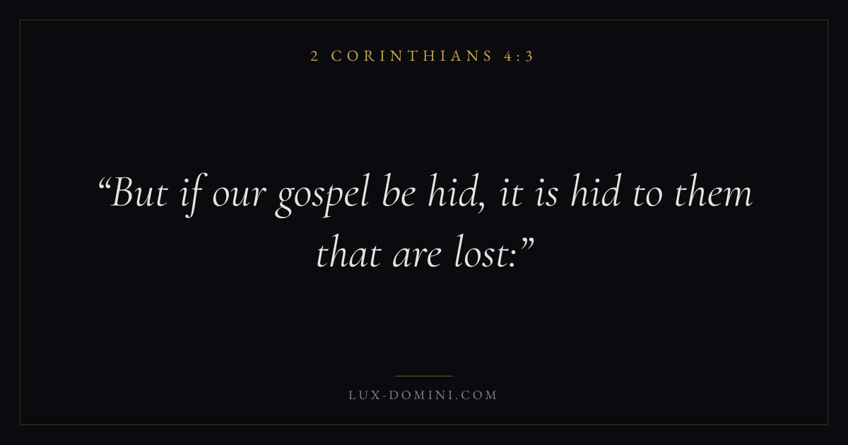 Books / 2 Corinthians / Chapter 4 / Verse 3 ← 2 Corinthians 4:2 2 Corinthians 4:3 2 Corinthians 4:4 → But if our gospel be hid, it is hid to them that are lost: Download verse card Share on Twitter Share on Facebook Pin it ✦ Key themes Suffering and trialsJustice and mercyWeaknessMinistry Read with 2 Corinthians 4:12 Corinthians 4:2Romans 8:182 Corinthians 4:17 Related topics Bible verses about suffering and trialsBible verses about justice and mercyBible verses about strength ✦ 2 Corinthians Chapter 4 verses V. 1 V. 2 V. 3 V. 4 V. 5 V. 6 V. 7 V. 8 V. 9 V. 10 V. 11 V. 12 V. 13 V. 14 V. 15 V. 16 V. 17 V. 18