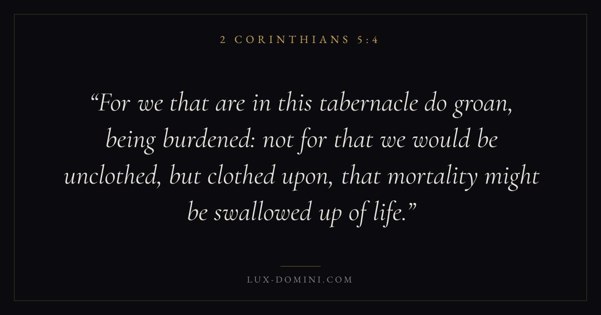 For we that are in this tabernacle do groan, being burdened: not for that we would be unclothed, but clothed upon, that mortality might be swallowed up of life.