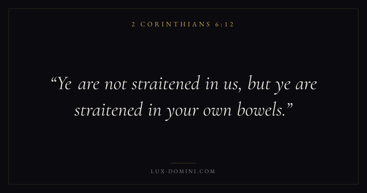 Books / 2 Corinthians / Chapter 6 / Verse 12 ← 2 Corinthians 6:11 2 Corinthians 6:12 2 Corinthians 6:13 → Ye are not straitened in us, but ye are straitened in your own bowels. Download verse card Share on Twitter Share on Facebook Pin it ✦ Key themes FaithSuffering and trialsTruthWeakness Read with 2 Corinthians 6:112 Corinthians 6:13Hebrews 11:1Romans 10:17 Related topics Bible verses about faithBible verses about suffering and trialsBible verses about truthBible verses about strength ✦ 2 Corinthians Chapter 6 verses V. 1 V. 2 V. 3 V. 4 V. 5 V. 6 V. 7 V. 8 V. 9 V. 10 V. 11 V. 12 V. 13 V. 14 V. 15 V. 16 V. 17 V. 18