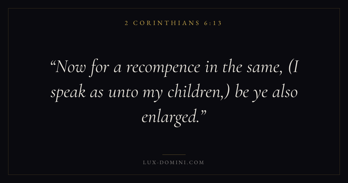 Books / 2 Corinthians / Chapter 6 / Verse 13 ← 2 Corinthians 6:12 2 Corinthians 6:13 2 Corinthians 6:14 → Now for a recompence in the same, (I speak as unto my children,) be ye also enlarged. Download verse card Share on Twitter Share on Facebook Pin it ✦ Key themes FaithSuffering and trialsTruthWeakness Read with 2 Corinthians 6:112 Corinthians 6:12Hebrews 11:1Romans 10:17 Related topics Bible verses about faithBible verses about suffering and trialsBible verses about truthBible verses about strength ✦ 2 Corinthians Chapter 6 verses V. 1 V. 2 V. 3 V. 4 V. 5 V. 6 V. 7 V. 8 V. 9 V. 10 V. 11 V. 12 V. 13 V. 14 V. 15 V. 16 V. 17 V. 18