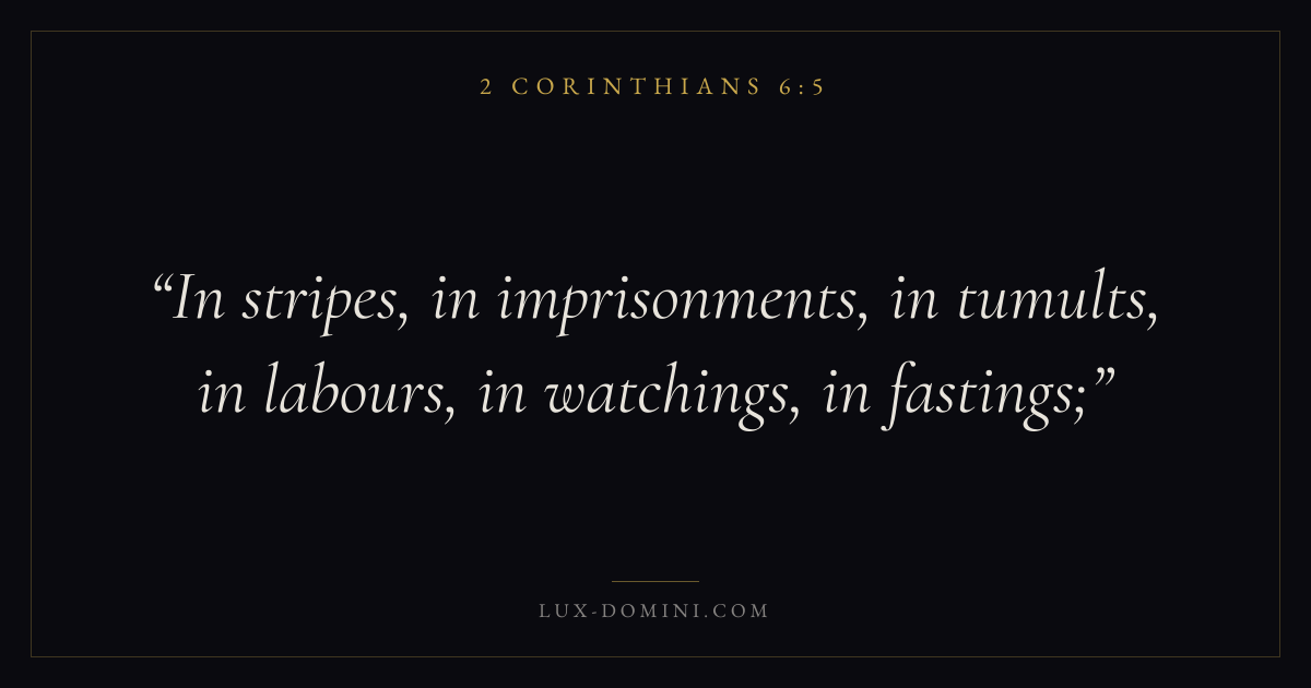 Books / 2 Corinthians / Chapter 6 / Verse 5 ← 2 Corinthians 6:4 2 Corinthians 6:5 2 Corinthians 6:6 → In stripes, in imprisonments, in tumults, in labours, in watchings, in fastings; Download verse card Share on Twitter Share on Facebook Pin it ✦ Key themes Suffering and trialsSalvationGraceTruthWeakness Read with 2 Corinthians 6:22 Corinthians 6:3Romans 8:182 Corinthians 4:17 Related topics Bible verses about suffering and trialsBible verses about salvationBible verses about graceBible verses about truthBible verses about strength ✦ 2 Corinthians Chapter 6 verses V. 1 V. 2 V. 3 V. 4 V. 5 V. 6 V. 7 V. 8 V. 9 V. 10 V. 11 V. 12 V. 13 V. 14 V. 15 V. 16 V. 17 V. 18