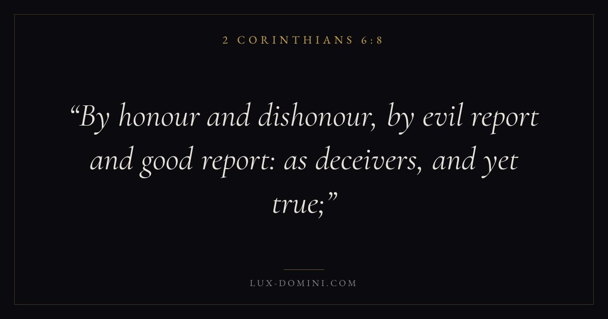 Books / 2 Corinthians / Chapter 6 / Verse 8 ← 2 Corinthians 6:7 2 Corinthians 6:8 2 Corinthians 6:9 → By honour and dishonour, by evil report and good report: as deceivers, and yet true; Download verse card Share on Twitter Share on Facebook Pin it ✦ Key themes Suffering and trialsSalvationGraceTruthWeakness Read with 2 Corinthians 6:72 Corinthians 6:9Romans 8:182 Corinthians 4:17 Related topics Bible verses about suffering and trialsBible verses about salvationBible verses about graceBible verses about truthBible verses about strength ✦ 2 Corinthians Chapter 6 verses V. 1 V. 2 V. 3 V. 4 V. 5 V. 6 V. 7 V. 8 V. 9 V. 10 V. 11 V. 12 V. 13 V. 14 V. 15 V. 16 V. 17 V. 18
