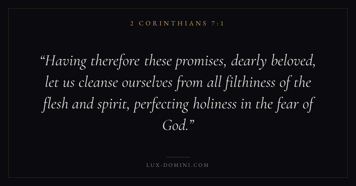 Having therefore these promises, dearly beloved, let us cleanse ourselves from all filthiness of the flesh and spirit, perfecting holiness in the fear of God.