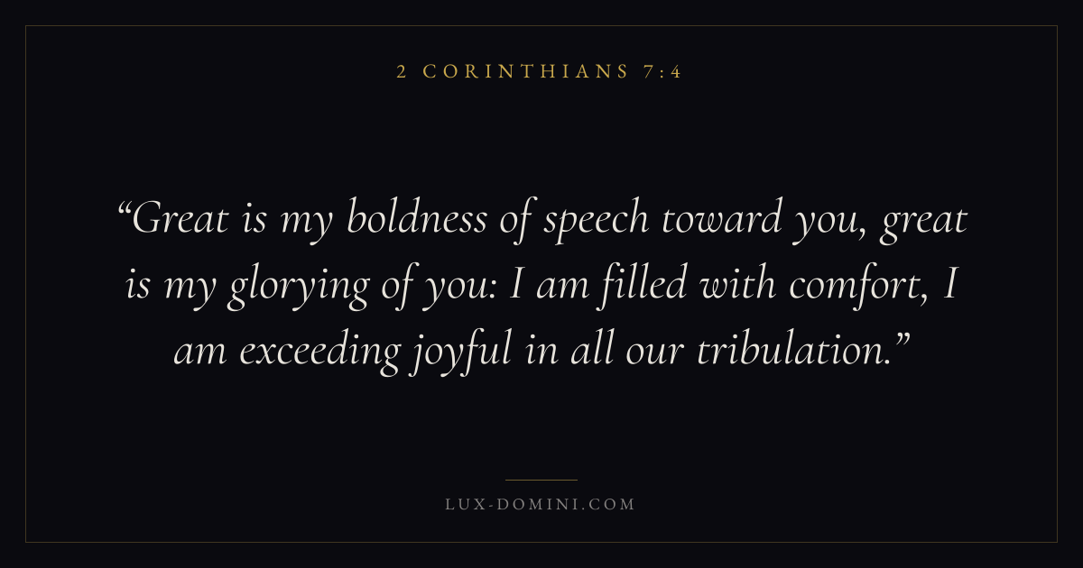Great is my boldness of speech toward you, great is my glorying of you: I am filled with comfort, I am exceeding joyful in all our tribulation.