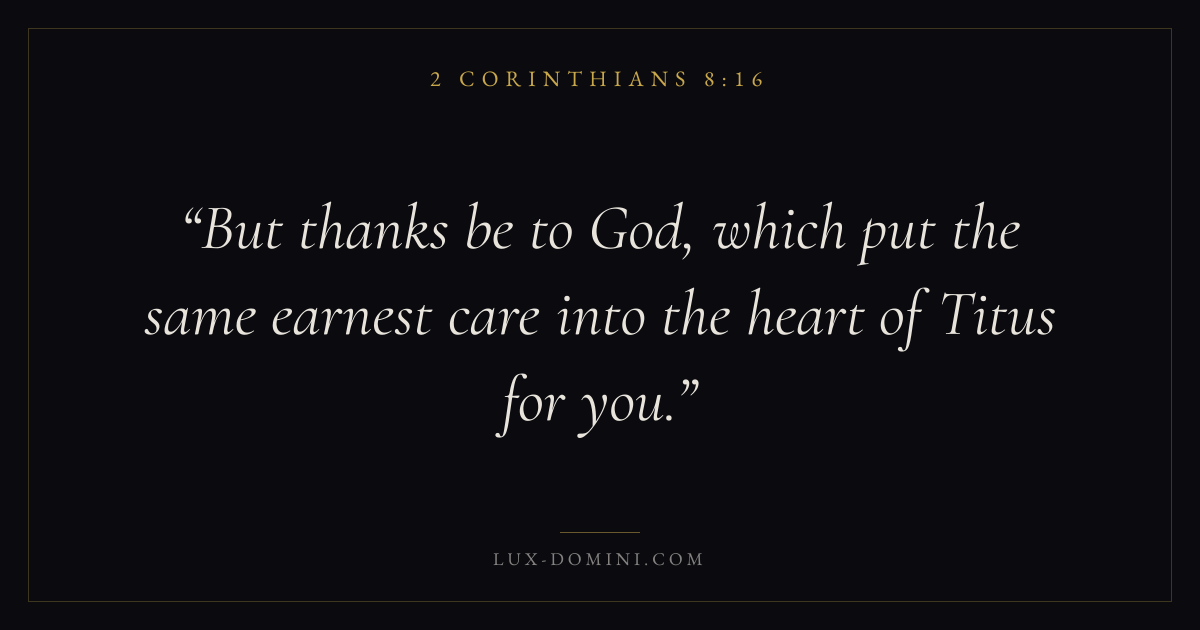 Books / 2 Corinthians / Chapter 8 / Verse 16 ← 2 Corinthians 8:15 2 Corinthians 8:16 2 Corinthians 8:17 → But thanks be to God, which put the same earnest care into the heart of Titus for you. Download verse card Share on Twitter Share on Facebook Pin it ✦ Key themes LoveSuffering and trialsWeaknessMinistry Read with 2 Corinthians 8:132 Corinthians 8:14John 3:161 Corinthians 13:4 Related topics Bible verses about loveBible verses about suffering and trialsBible verses about strength ✦ 2 Corinthians Chapter 8 verses V. 1 V. 2 V. 3 V. 4 V. 5 V. 6 V. 7 V. 8 V. 9 V. 10 V. 11 V. 12 V. 13 V. 14 V. 15 V. 16 V. 17 V. 18 V. 19 V. 20 V. 21 V. 22 V. 23 V. 24