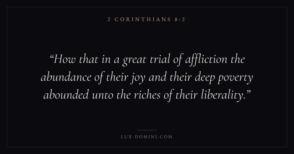 How that in a great trial of affliction the abundance of their joy and their deep poverty abounded unto the riches of their liberality.