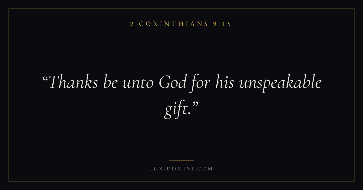 Books / 2 Corinthians / Chapter 9 / Verse 15 ← 2 Corinthians 9:14 2 Corinthians 9:15 2 Corinthians 10:1 → Thanks be unto God for his unspeakable gift. Download verse card Share on Twitter Share on Facebook Pin it ✦ Key themes LoveSuffering and trialsGraceWeakness Read with 2 Corinthians 9:122 Corinthians 9:13John 3:161 Corinthians 13:4 Related topics Bible verses about loveBible verses about suffering and trialsBible verses about graceBible verses about strength ✦ 2 Corinthians Chapter 9 verses V. 1 V. 2 V. 3 V. 4 V. 5 V. 6 V. 7 V. 8 V. 9 V. 10 V. 11 V. 12 V. 13 V. 14 V. 15