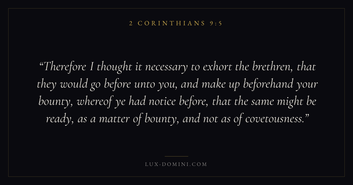 Therefore I thought it necessary to exhort the brethren, that they would go before unto you, and make up beforehand your bounty, whereof ye had notice before, that the same might be ready, as a matter of bounty, and not as of covetousness.