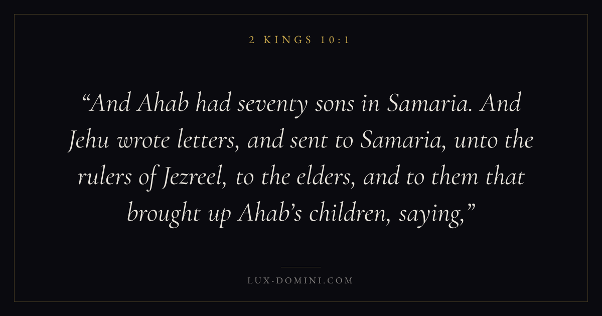 And Ahab had seventy sons in Samaria. And Jehu wrote letters, and sent to Samaria, unto the rulers of Jezreel, to the elders, and to them that brought up Ahab’s children, saying,