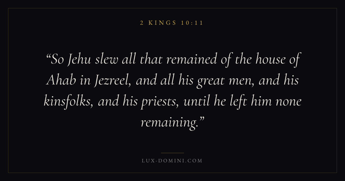 So Jehu slew all that remained of the house of Ahab in Jezreel, and all his great men, and his kinsfolks, and his priests, until he left him none remaining.