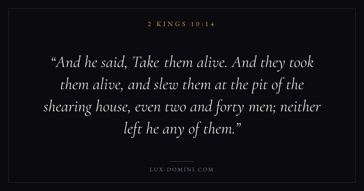 And he said, Take them alive. And they took them alive, and slew them at the pit of the shearing house, even two and forty men; neither left he any of them.