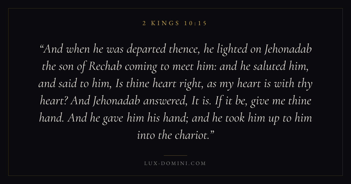 And when he was departed thence, he lighted on Jehonadab the son of Rechab coming to meet him: and he saluted him, and said to him, Is thine heart right, as my heart is with thy heart? And Jehonadab answered, It is. If it be, give me thine hand. And he gave him his hand; and he took him up to him into the chariot.