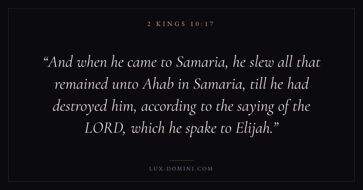 And when he came to Samaria, he slew all that remained unto Ahab in Samaria, till he had destroyed him, according to the saying of the LORD, which he spake to Elijah.