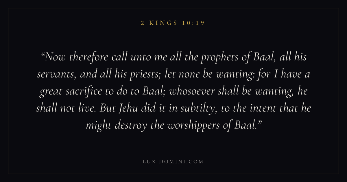 Now therefore call unto me all the prophets of Baal, all his servants, and all his priests; let none be wanting: for I have a great sacrifice to do to Baal; whosoever shall be wanting, he shall not live. But Jehu did it in subtilty, to the intent that he might destroy the worshippers of Baal.