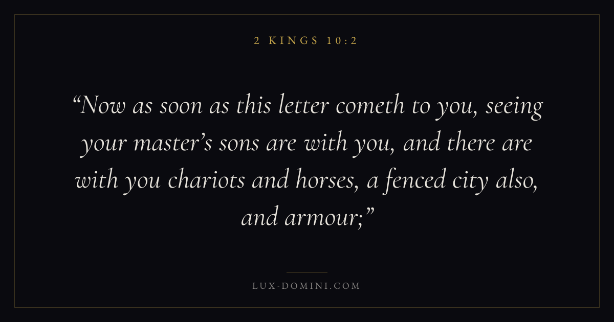 Now as soon as this letter cometh to you, seeing your master’s sons are with you, and there are with you chariots and horses, a fenced city also, and armour;