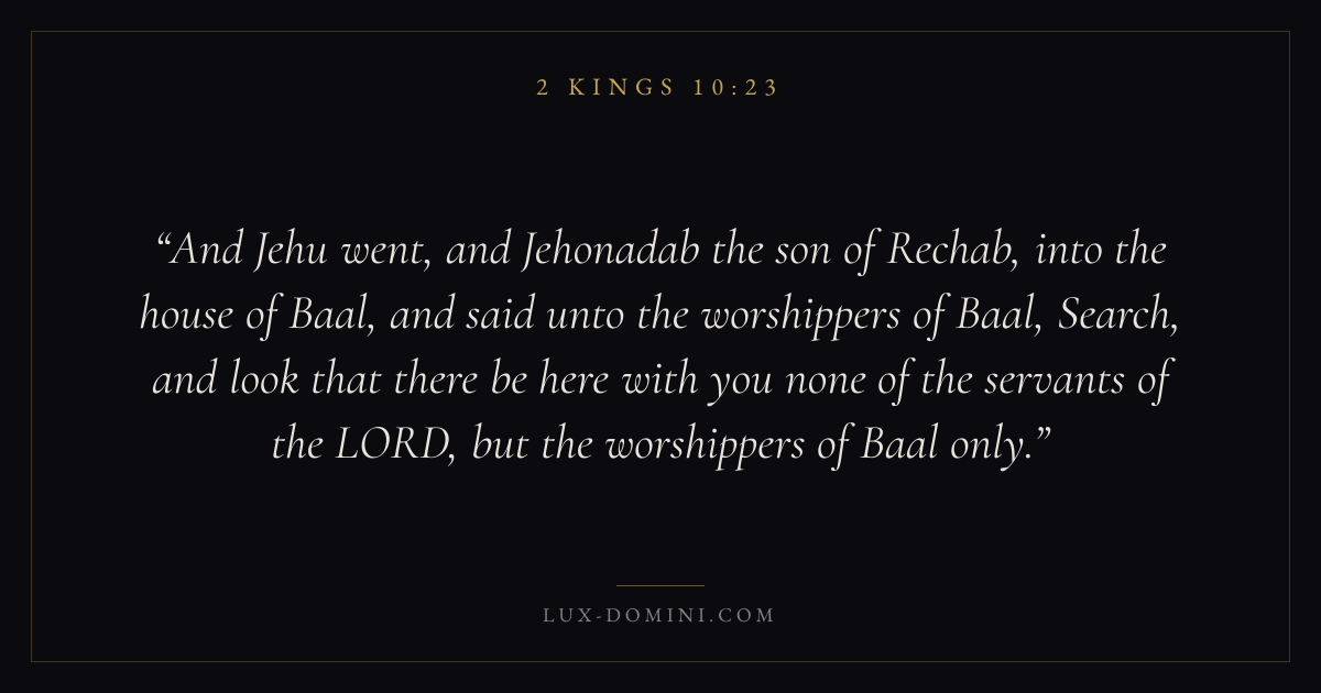 And Jehu went, and Jehonadab the son of Rechab, into the house of Baal, and said unto the worshippers of Baal, Search, and look that there be here with you none of the servants of the LORD, but the worshippers of Baal only.