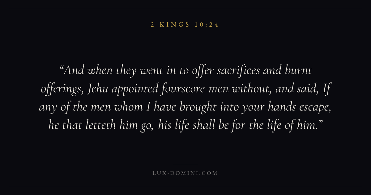 And when they went in to offer sacrifices and burnt offerings, Jehu appointed fourscore men without, and said, If any of the men whom I have brought into your hands escape, he that letteth him go, his life shall be for the life of him.