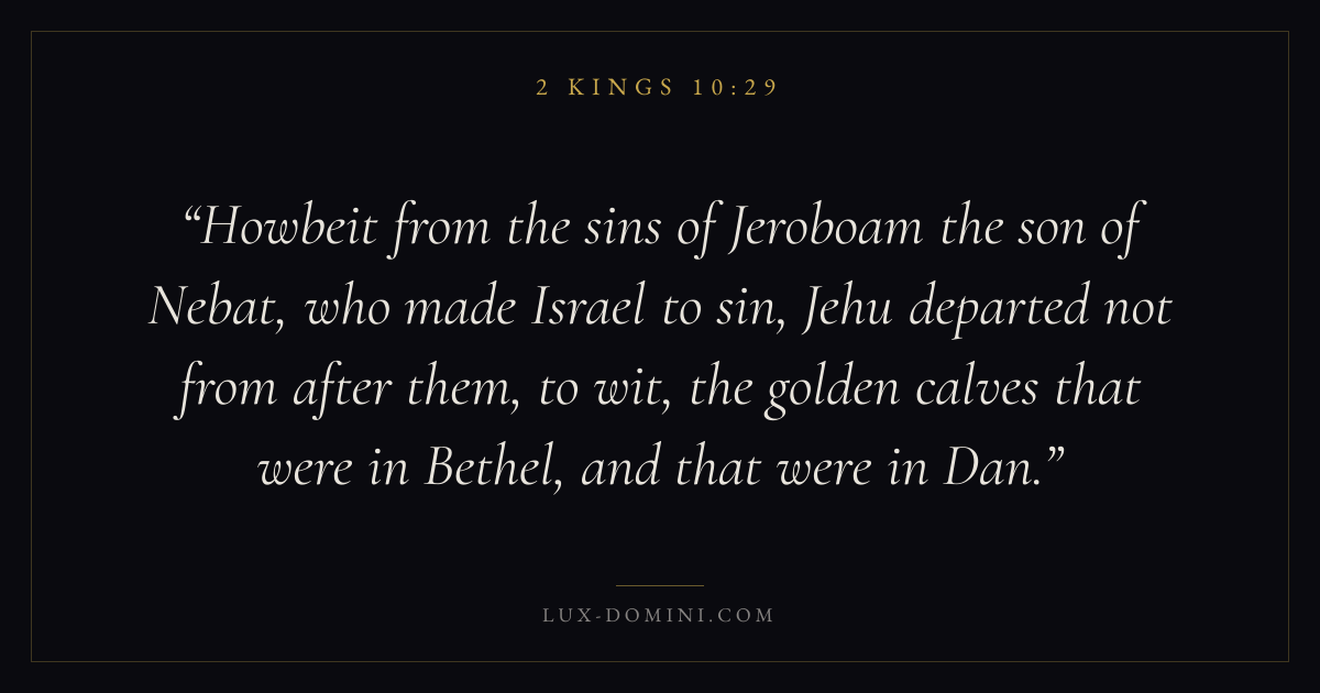 Howbeit from the sins of Jeroboam the son of Nebat, who made Israel to sin, Jehu departed not from after them, to wit, the golden calves that were in Bethel, and that were in Dan.