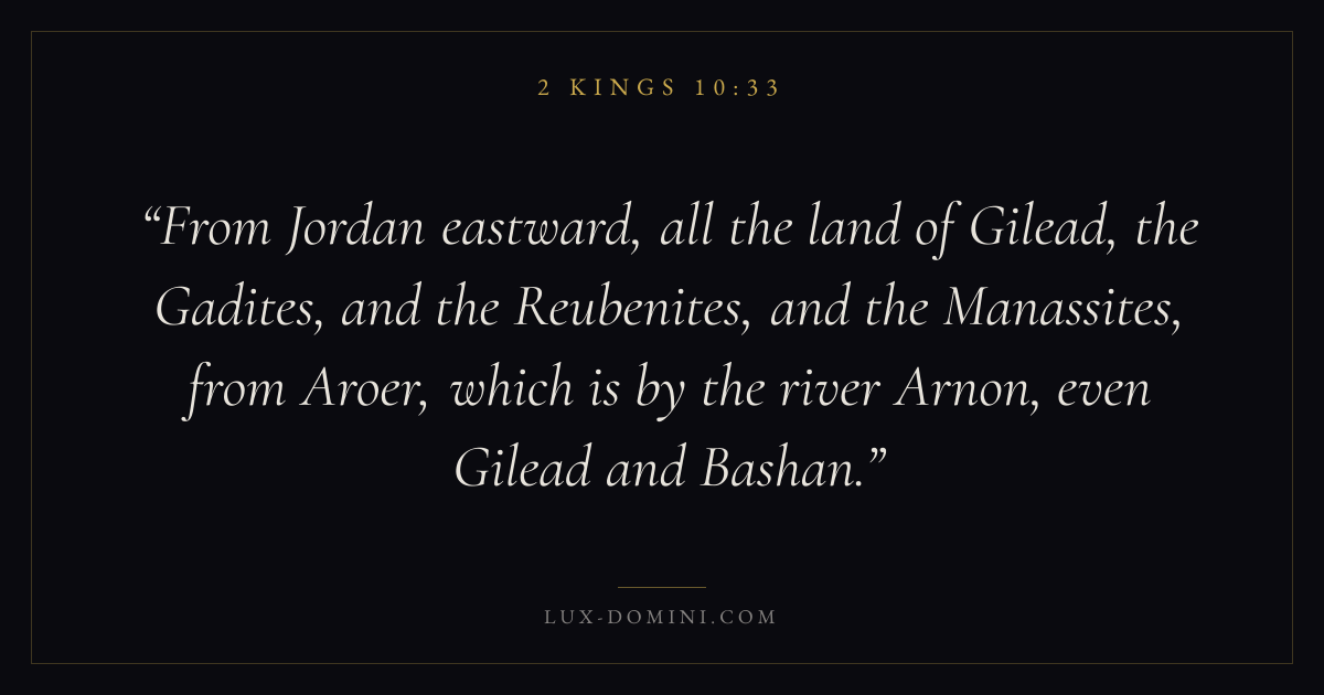 From Jordan eastward, all the land of Gilead, the Gadites, and the Reubenites, and the Manassites, from Aroer, which is by the river Arnon, even Gilead and Bashan.