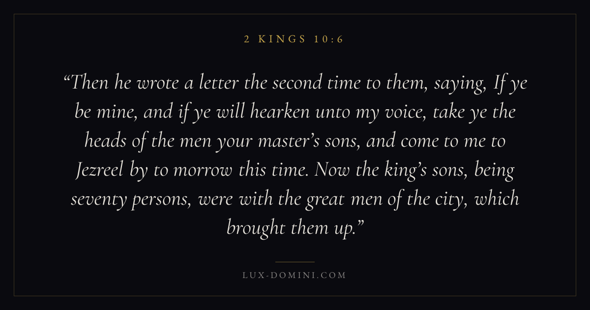Then he wrote a letter the second time to them, saying, If ye be mine, and if ye will hearken unto my voice, take ye the heads of the men your master’s sons, and come to me to Jezreel by to morrow this time. Now the king’s sons, being seventy persons, were with the great men of the city, which brought them up.
