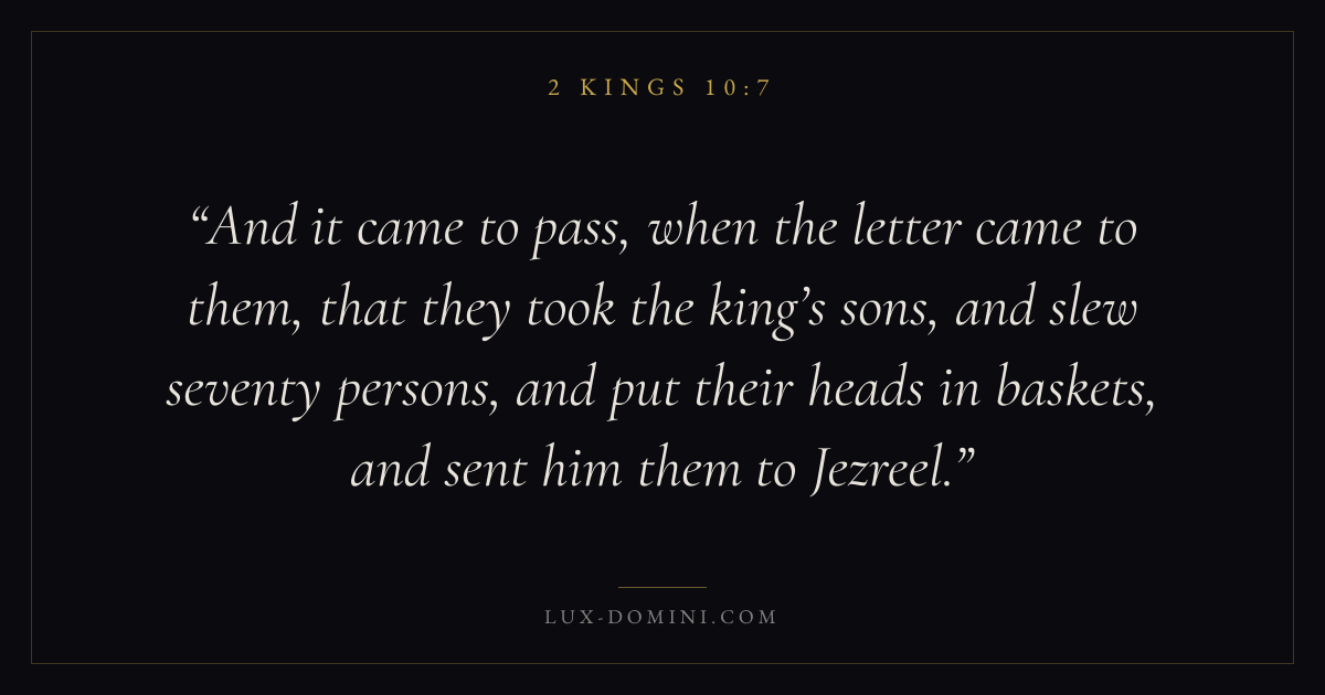 And it came to pass, when the letter came to them, that they took the king’s sons, and slew seventy persons, and put their heads in baskets, and sent him them to Jezreel.