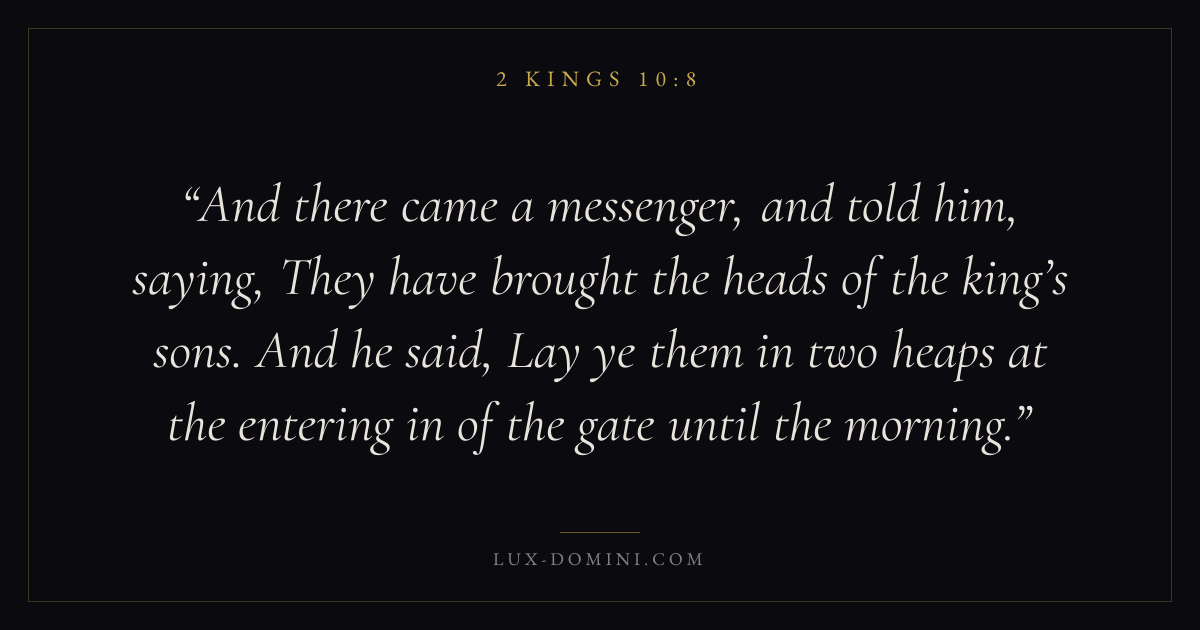 And there came a messenger, and told him, saying, They have brought the heads of the king’s sons. And he said, Lay ye them in two heaps at the entering in of the gate until the morning.