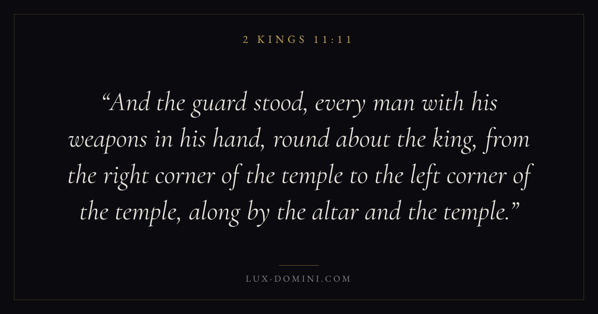 And the guard stood, every man with his weapons in his hand, round about the king, from the right corner of the temple to the left corner of the temple, along by the altar and the temple.