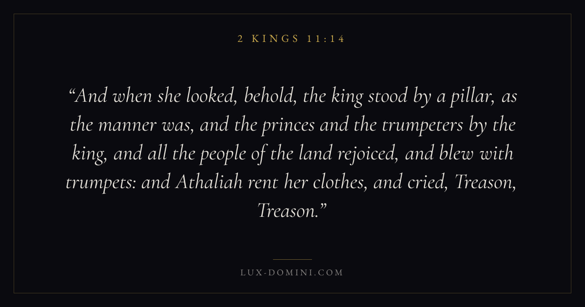 And when she looked, behold, the king stood by a pillar, as the manner was, and the princes and the trumpeters by the king, and all the people of the land rejoiced, and blew with trumpets: and Athaliah rent her clothes, and cried, Treason, Treason.