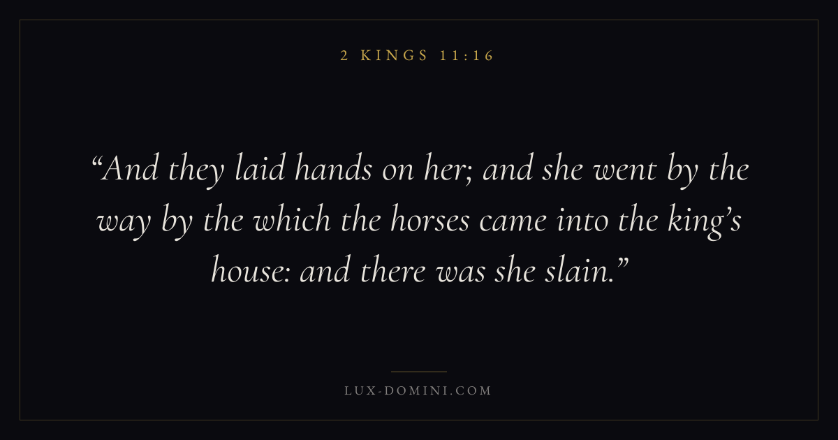 And they laid hands on her; and she went by the way by the which the horses came into the king’s house: and there was she slain.