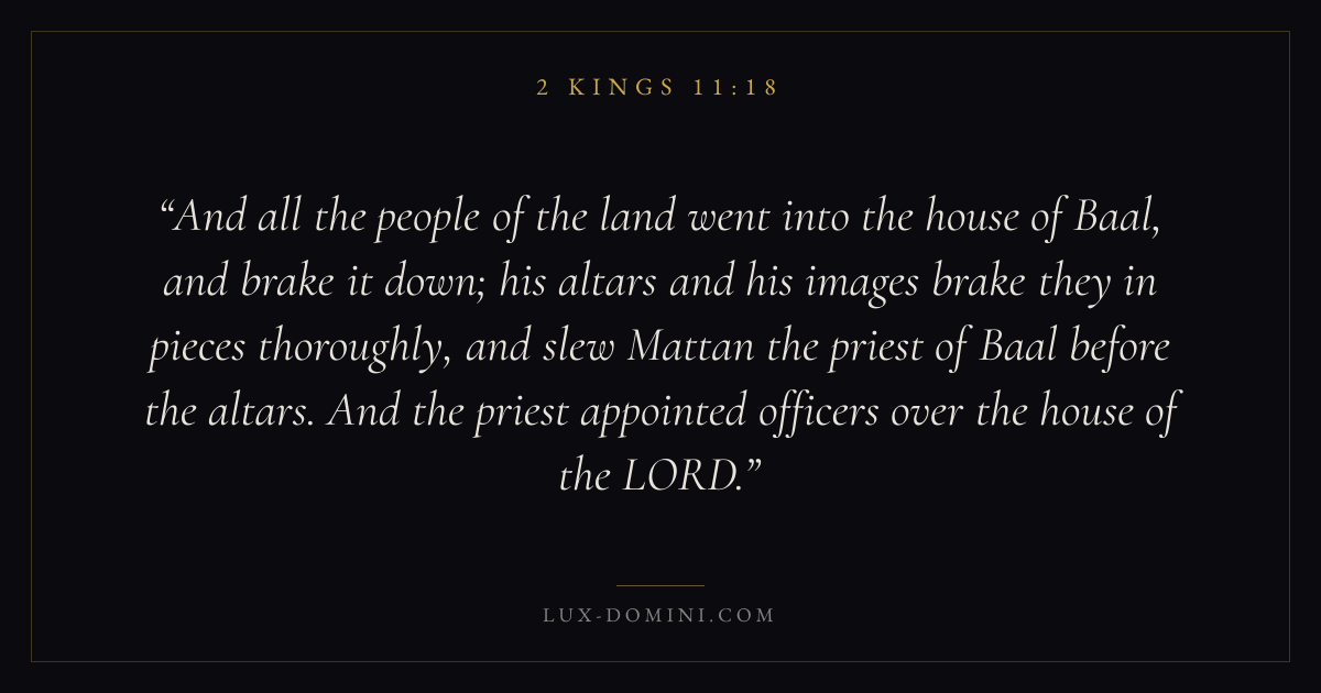 And all the people of the land went into the house of Baal, and brake it down; his altars and his images brake they in pieces thoroughly, and slew Mattan the priest of Baal before the altars. And the priest appointed officers over the house of the LORD.