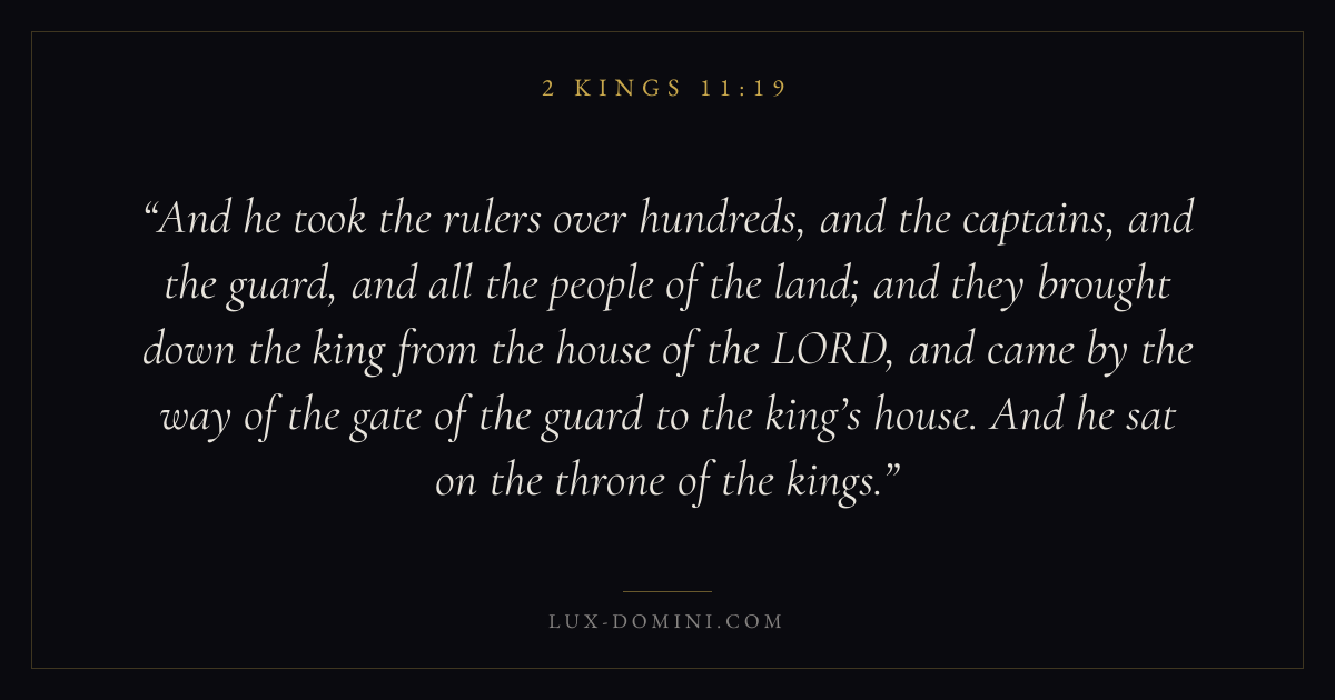 And he took the rulers over hundreds, and the captains, and the guard, and all the people of the land; and they brought down the king from the house of the LORD, and came by the way of the gate of the guard to the king’s house. And he sat on the throne of the kings.