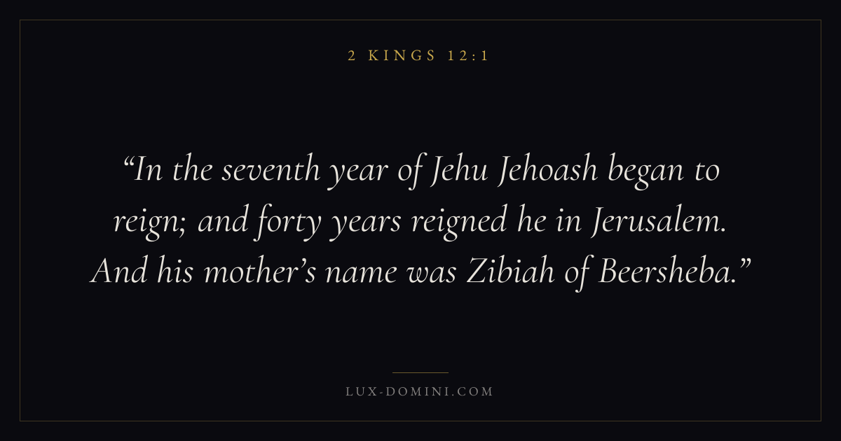 In the seventh year of Jehu Jehoash began to reign; and forty years reigned he in Jerusalem. And his mother’s name was Zibiah of Beersheba.