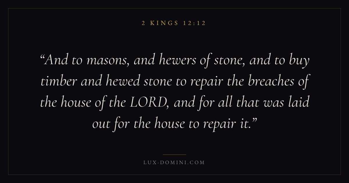 And to masons, and hewers of stone, and to buy timber and hewed stone to repair the breaches of the house of the LORD, and for all that was laid out for the house to repair it.