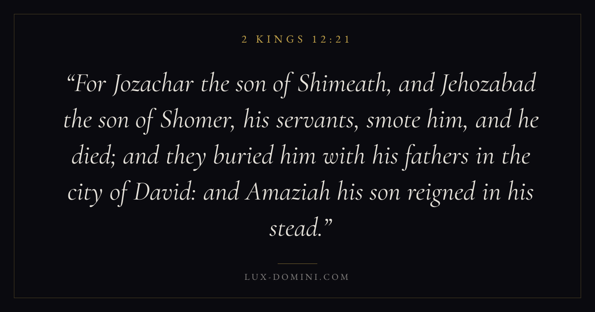 For Jozachar the son of Shimeath, and Jehozabad the son of Shomer, his servants, smote him, and he died; and they buried him with his fathers in the city of David: and Amaziah his son reigned in his stead.
