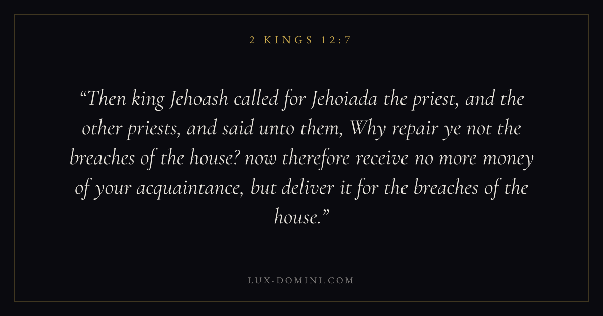 Then king Jehoash called for Jehoiada the priest, and the other priests, and said unto them, Why repair ye not the breaches of the house? now therefore receive no more money of your acquaintance, but deliver it for the breaches of the house.