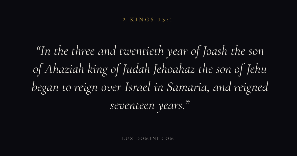 In the three and twentieth year of Joash the son of Ahaziah king of Judah Jehoahaz the son of Jehu began to reign over Israel in Samaria, and reigned seventeen years.