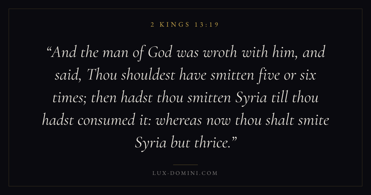 And the man of God was wroth with him, and said, Thou shouldest have smitten five or six times; then hadst thou smitten Syria till thou hadst consumed it: whereas now thou shalt smite Syria but thrice.