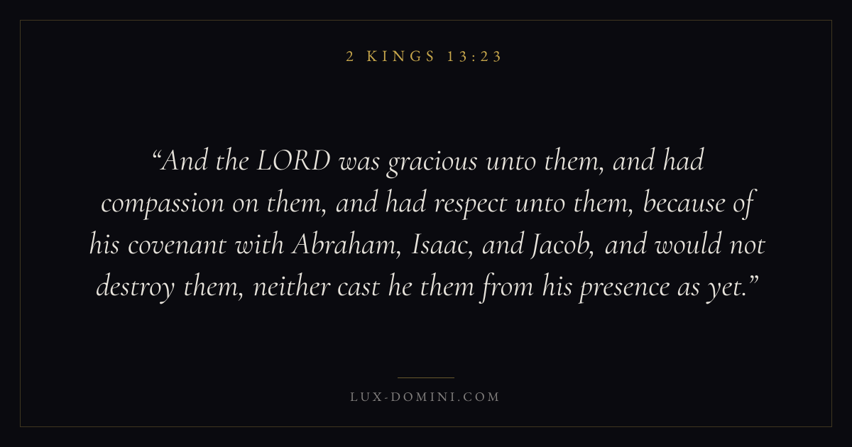 And the LORD was gracious unto them, and had compassion on them, and had respect unto them, because of his covenant with Abraham, Isaac, and Jacob, and would not destroy them, neither cast he them from his presence as yet.